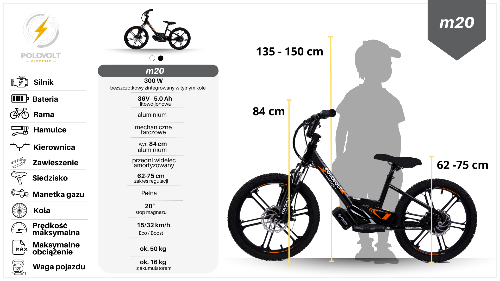 Zbudowany z lekkich i wytrzymałych materiałów, takich jak aluminium, Polovolt M-20 waży zaledwie 16 kg, co sprawia, że jest łatwy do manewrowania i przenoszenia. Jego solidna rama i stalowy widelec gwarantują trwałość i bezpieczeństwo podczas jazdy.